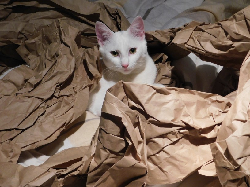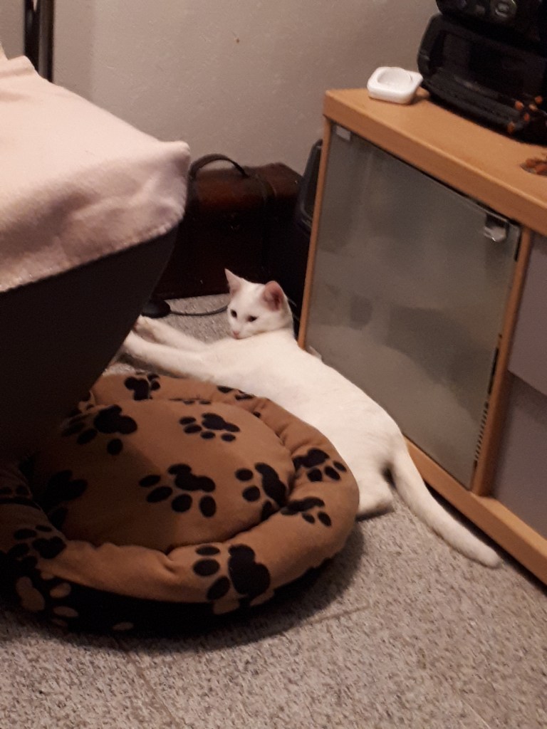 Snow (biała kotka) ma 1 rok – od urodzenia żyje w świecie ciszy… – jest całkowicie głucha. To bardzo przyjazna i potrzebująca czułości kotka. Jak na rok życia, to jest trochę wychudzona – pochłania wręcz jedzenie. Jest sprytna, mądra i ciekawska 🙂