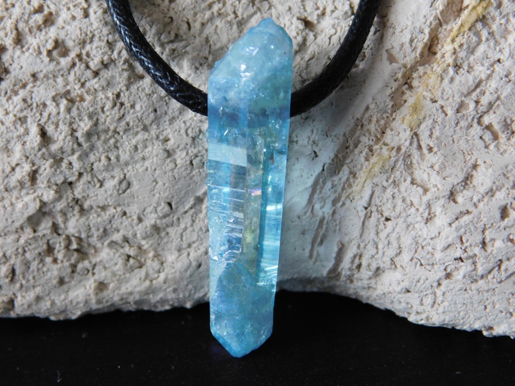 Talizman od Lastomine – Aqua Aura – kryształ surowy, naturalny w reakcji z czystym złotem. Pomaga odkryć i aktywować zdolności takie jak: jasnowidzenie, czy telepatię. Kamień radości, lekkości i szczęścia.