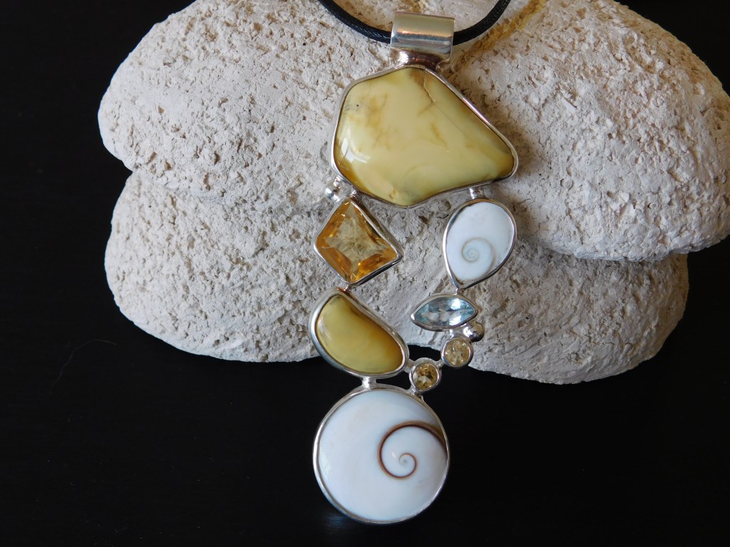 UNIKAT! Wisiorek z bursztynu, cytrynu, topazu i ślimaka Nautilus w srebrze (925). Ręczne wykonanie.