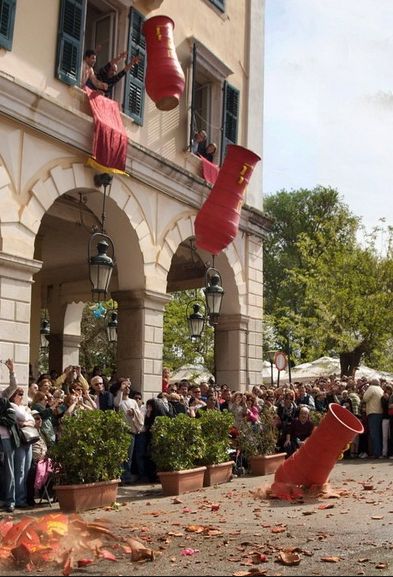 Uważaj na latające naczynia na greckiej wyspie Korfu. (Uwaga: to nie ma nic wspólnego z rodzinnymi waśniami.) Dokładnie o 11 rano w niedzielę wielkanocną mieszkańcy Korfu wyrzucają gliniane garnki (różnej wielkości) ze swoich balkonów.