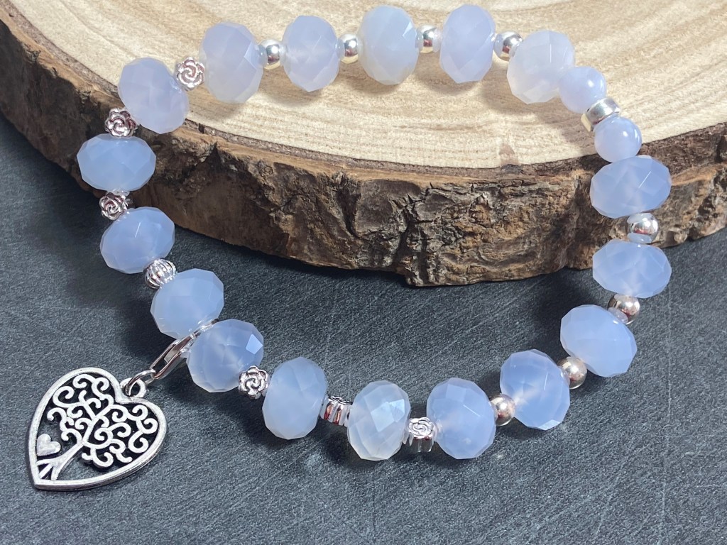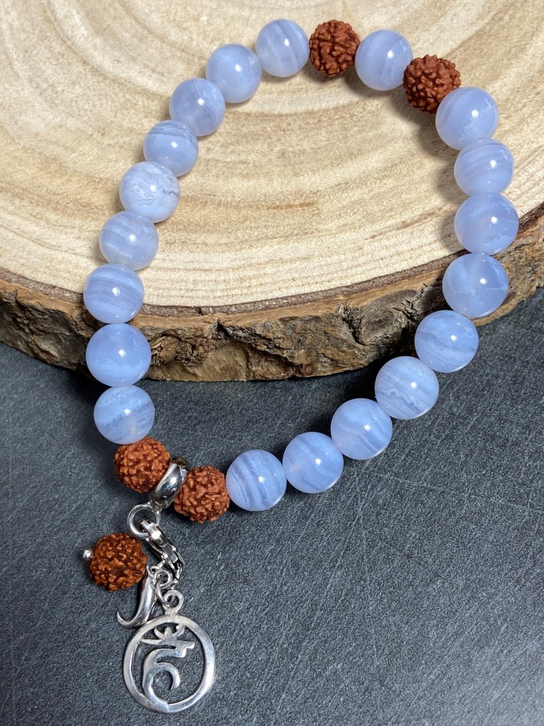 Chalcedon niebieski zaliczany jest do kamieni, które harmonizują i wzmacniają czakrę gardła – centrum komunikacji, prawdy i wyrażania siebie. Wspiera łagodną, szczerą rozmowę oraz pomaga usuwać blokady w mówieniu i słuchaniu sercem.